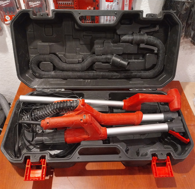 A gép nagy, 225mm átmérőjű csiszolópapírt vagy csiszolóhálót fogad, amelyet üzletünkben akár darabra is vásárolhat 60-tól akár 240-es finomságig. Ezeknek a rögzítése igazán egyszerű, mivel a csiszolótányérhoz tépőzáras módon csatlakoztatható, így a cseréjs is rendkívül gyorsan végrehajtható. Emellett a géphez csatlakoztatható ipari porszívót is kölcsönözhet nálunk. Fontos, hogy a csiszolópapíron lévő lyukak egybe essenek a tárcsán lévőekkel, így lesz igazán hatékony a keletkezett por elszívása. A gép motorja 600W teljesítményű, amely garantálja a hatékony csiszolást még a nehezebb felületeken is. A gép minőségi, fém szöghajtóműve megbízhatóságot és tartósságot biztosít. A csiszolófej jobb mozgatásához a gép csuklócsapágyai is hzzájárulnak. A rugalmas mozhatás könnyű kezelhetőséget és precíz csiszolást biztosít. A zsiráf motorjának fordulatszáma változtatható, így mindig az adott falfelület típusáház és a csiszolandó anyaghoz lehet állítani, így optimális eredményt érhet el. A munka kezdésekor, főleg mennyezet esetén és kevésbé tapasztalt bérlőknek ajánlott a csiszolást kisebb fordulatszámmal kezdeni és fokozatosan növelni. A gép ergonómikus T-fogója kényelmes használatot tesz lehetővé és egyben a felhasználó ezzel biztosan tarthatja a gépet a munkavégzés közben. A gépet egy zárható kofferben adjuk át. A falcsiszoló zsiráf bérlésekor nem szükséges nagy járművel érkeznie, szállítókofferben a gép összehajtva tárolhat és szállítható, valamint a toldója is külön válsztható a géptől.